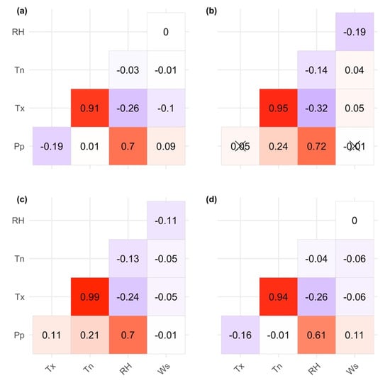 Inter-correlation of daily climate variables (precipitation (Pp), maximum temperature (Tx), minimum temperature (Tn), relative humidity (RH), and wind speed (Ws)) for (a) observation, (b) regional climate model data (RAW), (c) univariate bias correction (UBC), and (d) multivariate bias correction (MBC) for the 1989–2005 period. X denoted correlation values that are below significance level p = 0.05.