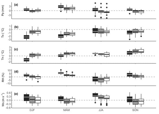 On the other hand, the Ws RAW tends to overestimate observation for all seasons (Figure 3e). The windspeed overestimation is supported by Li et al. [], who compared Ws observation with CNMR-CM (Centre National de Recherches Météorologiques Climate Model National Center for Meteorological Research-Climate Model 5) model output. However, compared to other variables, Ws gives a wider bias variability during all seasons, while both bias-correction methods successfully reduces the biases, but bias variability still remains. Overall, MBC shows better performance than UBC in reducing Ws model bias.