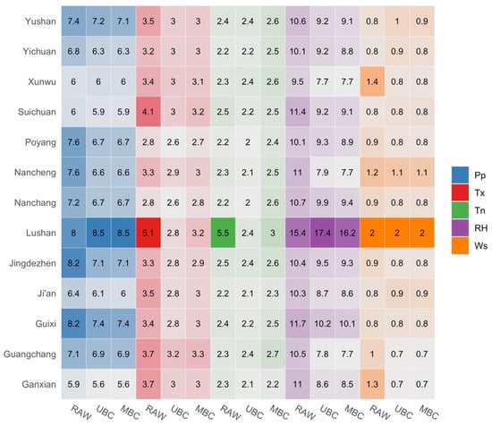 As clearly seen, Lushan station has relatively high RAW bias compare to other stations, which is caused by model limitation to simulate orographic processes in high-elevation areas (Table 1). Similarly, Liu, Z. et al. [] found large differences between observed and modeled data indicated by the difference between modeled (ERAINT) elevation and site elevation. However, temperature is relatively easy to bias-correct [] compared to precipitation which is predicted through model parameterization of temperature and humidity from observation []. Furthermore, both UBC and MBC give no improvement for Pp, RH, and WS in areas with high topography (Lushan station). The result is consistent with previous research which gives less significance in precipitation bias correction for regions that experience significant orographic effects (such as mountainous areas) [].