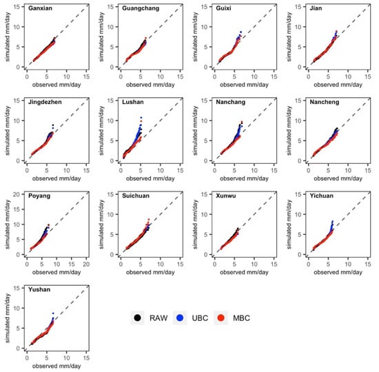 On the other hand, in general, the RAW shows a strong overestimating trend in lower Peff values (0–5 mm) and underestimates in high Peff values for all stations (Figure 6). Furthermore, result shows that the performance of both methods show better skill in correcting RAW at low values, but less successful in correcting extreme values. In detail, it can be seen from the data in Table 3 that MBC provides a better bias correction (smaller MAE) than UBC except for Jian (UBC = 1.57, MBC = 1.58) and Lushan (UBC = 2.03, MBC = 2.09). Overall, MBC shows better improvement in daily station average correlation and MAE than UBC.