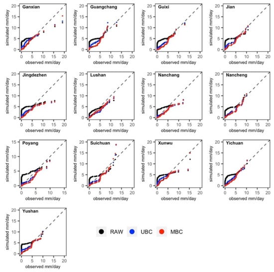 The UBC method establishes the quantile mapping (QM) technique. The QM algorithms are commonly used to correct systematic distributional biases in precipitation [,]. This method is based on quantile association and has many names in literature such as statistical downscaling, quantile mapping, histogram equalizing, and rank matching [,]. The QM method has been widely used in previous studies and has shown excellent results in correcting model bias [,,,,].