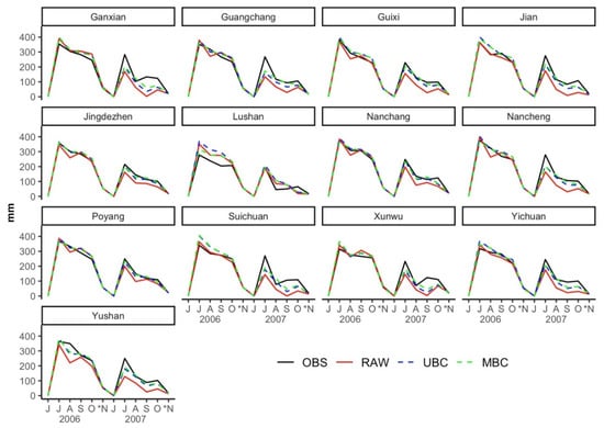 Overall, the two correction-bias methods used can correct the bias that exists between observation and the model. Moreover, in 2007, observation and RAW difference is higher compared to the previous year, but both UBC and MBC successfully reduce the existing bias. Similar to the last analysis (Figure 4), an unrealistic result is obtained for the Lushan area (overestimation) due to UBC and MBC’s inability to correct the existing bias, especially for precipitation.