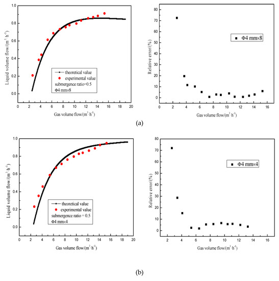 When the air intake is small, the relative error is very large; with the increase of the air intake, the relative error gradually reduces. Near the minimum value, the experimental values are in good agreement with the theoretical values, and the relative error is less than 5%. When the air intake increases gradually, the relative error gradually rises to more than 5%. The main reason is that the slip ratio formula used in this paper is based on conclusions gained by Griffith et al. [37] under slug flow. The closer the flow pattern is to slug flow, the smaller the error between the theoretical value and experimental value.