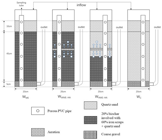 The schematic setup of four reactors is shown in Figure 1. Four light-proof laboratory-scale SSFCWs were set up in Qingdao, Shandong, China. These SSFCW cylinders were made of polyvinyl chloride, with the height of 600 mm and diameter of 200 mm. Quartz sand (diameter: 2–4 mm;), iron scraps (10–15 mm;) and biochar (10–15 mm) were three main substrates for the middle layer. The middle 450 mm layers of the four SSFCWs were installed with different substrate as follows: (1) Fe/C-M/E system (WME): 20% biochar including 60% iron scraps and quartz sand; (2) whole-course Fe/C-M/E coupled half-way aeration system (WWME-HA); 20% biochar including 60% iron scraps and quartz sand; (3) half-way Fe/C-M/E coupled half-way aeration system (WHME-HA): upper part is quartz sand, lower part is 20% biochar including 60% iron scraps and quartz sand; (4) blank control system (WC): only quartz sand. At the bottom (50 mm) of the four systems, coarse gravel (20–30 mm) was filled as the supporting layer and the top (100 mm) of CWs were also covered with quartz sand (diameter: 2–4 mm). The effluent water level was set at the height of 500 mm to guarantee the flooded status of most substrate in CWs and simulate the real function status of SSFCW. No plants were involved in these systems, since the contribution of pollutant removal by plants in vertical subsurface flow constructed wetland was reported to be less than 20% [8]. Three polyvinyl chloride (PVC) aeration pipes were each inserted in to the middle of substrates in WWME-HA and WHME-HA and providing the aeration with 1 L/min (as shown in Figure 1). In addition, a porous PVC pipe was inserted vertically through substrate to take out the samples from different heights and measure the indexes of temperature, pH, DO, oxidation reduction potential (ORP) and other physical and chemical properties of the systems in situ.