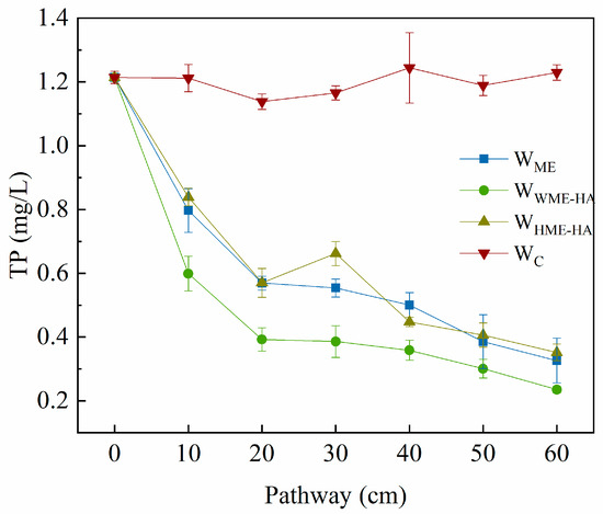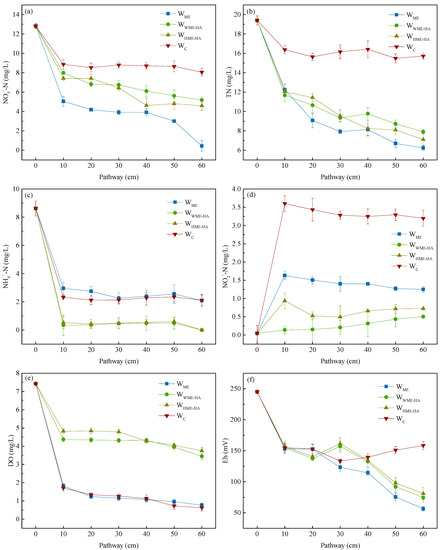 The concentrations of TN (Figure 3b) in 0–10 cm were all decreased in all four systems. It can be deduced that simultaneous nitrification and denitrification process occurred in the 0–10 cm section of all the four CWs. However, the TN concentration tended to be stable in WC in 10–60 cm, while it gradually decreased in WME, WWME-HA and WHME-HA. Among them, the removal effect in WME was slightly better than that of WWME-HA and WHME-HA.