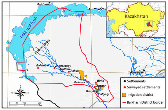Given the harshness of the environment and lack of water, it is not surprising that the 37,400 km2 Balkhash District contains just 30,700 inhabitants who live mainly in 34 settlements near lakes and streams. The region’s economic activity emphasizes pasture-based animal husbandry, recreational and commercial fishing, and extraction of minerals, and it is based on maximum exploitation of water and other natural resources [24,25,26,27]. Due to the extremely arid climate and high energy costs, irrigation for agriculture is only possible in two small gravity-fed areas near the Ili River (Figure 1).