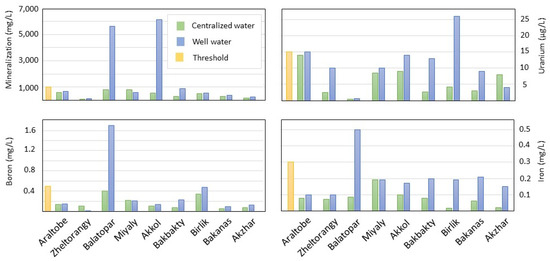 Chemical analysis of centralized water (green bars) and well water (blue bars) from the nine villages for the presence of dry mineralization, uranium, boron, and iron. The yellow bars indicate water quality thresholds as determined by the government of Kazakhstan [45].