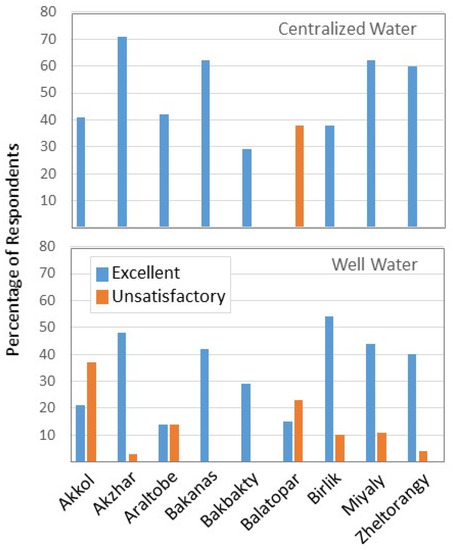A total of 737 individuals from the nine villages responded to surveys about water quality. Ratings from households with centralized water were segregated from those with access to only well water (Figure 3). Water quality was rated excellent by 29–71% of respondents with centralized water and just 14–54% of respondents with well water. Village by village comparisons of ratings of excellent confirm that in six of these eight settlements, the percentage of respondents satisfied with centralized water was higher than the percentage satisfied with well water. The two exceptions to this pattern are Bakbakty, where 29% of respondents in both classes of households rated their water as excellent, and Birlik, where 38% of respondents with centralized water and 54% of households with access only to wells rated their water as excellent.