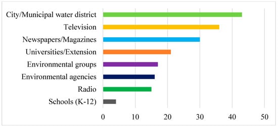 Among the water resources information sources, city/municipal water districts were the most common information source (43%) for respondents (Figure 1), followed by television (36%), and newspapers/magazines (30%). The least common sources for respondents were schools (4%), radio (15%), environmental agencies (16%), and environmental groups (17%).