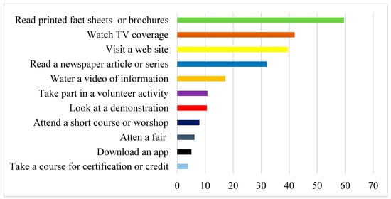 The preference for learning opportunities has changed over time []. Web pages have emerged as the most preferred method for obtaining water resources information []. This was also documented by Mahler et al. [] who found that the predominant public information sources for water resources in the Pacific Northwest changed from newspapers, TV, and environmental agencies in 2000 to the Internet in 2017. A more recent study in Texas showed that the majority of respondents prefer to learn about water-related issues by visiting a website, followed by reading fact sheets, bulletins, or brochures []. In addition to temporal changes, demographic factors such as age [] and education [] also affect the preferences of learning opportunities.