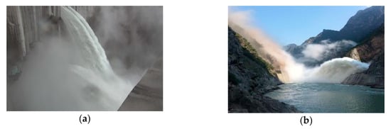 As fundamental infrastructure components of flood control and energy development systems, many large hydraulic projects have been constructed or are under construction globally [1,2,3]. The flood discharge security of these projects largely depends on the reasonable design of releasing structures and security regulations suitable for discharge environments [4]. Changes in the local meteorological environment induced by atomized flow during flood discharge are commonly manifested as super-heavy rain and widespread mist—namely, flood discharge atomization. This situation can be seen from Jinping-1 Hydropower Station in Figure 1, where, under different energy dissipation conditions, the atomized rain intensity has been measured as high as 534 mm/h when induced by dam orifice discharging (Q = 4100 m3/s, 2#/4# deep orifices and 2#/3# surface orifices in Figure 1a) and up to 331 mm/h when induced by spillway tunnel discharging (Q = 2130 m3/s, gate opening of 75% in Figure 1b [5]. In surveying global studies on atomized flow, it is found that most flood discharge atomization occurs in China, especially for hydropower stations with ski-jump energy dissipation characterized by high heads, high discharge and deep canyons. It has been widely recognized that hazard sources arise from strong atomized rain, and major atomized rain sources are generated by aerial waterjet collisions and the hydraulic impact of falling waterjets into a water cushion [6]. With approximately 30 years of progressive research, the damages caused by strong atomized rain have been greatly reduced, but they still occur occasionally, such as the severe landslides at the Longyangxia Hydropower Station in 1987 and 1989 due to its soft geology and arid climate [7], the unexpectedly high level of atomized rain at the Ertan Hydropower Station due to a high energy dissipation ratio with aerial waterjet collisions in 1998 [8], the rare rainstorm disaster of the Shuibuya Hydropower Station formed by the combination of atomized and natural rain in 2016 [9], and the flood at the Nazixia Hydropower Station Powerhouse due to unreasonable design in 2017 [10]. Moreover, the slip square has reached 81 million m3 in the “1989·7·26” slope instability of the Longyangxia Hydropower Station [7], and the direct economic loss has reached about 50 million yuan for the “2016·7·19” flood event of the Shuibuya Hydropower Station [9]. From the above, we can see that such strong precipitation events probably led to a variety of direct damages and secondary disasters such as those resulting from extreme natural rain events, which can bring more severe economic and environmental consequences with characteristics of the new age [11,12]. To minimize production and living damage, partition protections have been acknowledged as a mitigation strategy according to rain thresholds based on precipitation forecast results. Therefore, predicting and controlling flood discharge atomization is a long-term goal, especially for projects with unique structures or complex designs. Furthermore, due to both generation and diffusion processes of atomized rain containing complicated water-air interactions, the low ambient pressure environment possibly affects the atomization processes to a varying degree, which will increase the uncertainty of the prediction of the distribution of rain atomization. The challenge of flood discharge atomization increases because some hydropower stations with ski-jump energy dissipation are constructed and operated in areas with low air density. For example, the ambient pressure of the Rumei spillways is only 73.53 kPa, which means the operating pressure is only 0.72 that of the standard pressure P0 (101.53 kPa) [5,13].