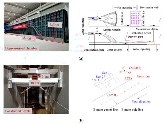 As shown in Figure 2a, the depressurized chamber was designed as a cuboid with an internal volume of 51.00 m (length) × 4.50 m (height) × 1.25 m (width). The water-regulating and air-regulating devices were installed outside the depressurized chamber. In the depressurized chamber, a coordinate system was built by taking the center point of the constricted nozzle outlet as the coordinate origin, in which the x-axis, y-axis, and z-axis separately represent the flow direction, transverse direction, and vertical direction; the experimental area is 1487 cm long along the flow direction, which is surrounded by the depressurized chamber walls and a rectangular weir (125 cm in width and 56 cm in height).