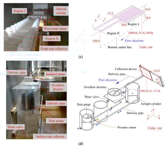 The first set of the experiment (Exp.1) was designed to measure the point rain amount in the horizontal plane by an electronic scale (accuracy of 0.01 g and range of 5 kg), as detailed in Figure 2a,c. The point rain collecting device is located 450.00 cm long in the horizontal plane at the elevation of −50.00 cm, which includes two sections with upstream pile numbers of 984.00 cm and 1261.30 cm. Ninety-one (13 × 7 matrix) and 28 (14 × 2 matrix) measurement points were placed separately in Regions I and II, respectively, for point rain collecting. The location of the center point on the rain point collector entrance face (500 mL measurement cylinder with a diameter of 5.75 cm) is defined as the measurement point coordinate. The rain collectors are placed at constant transects spacing 10.60 cm apart in the measurement plane, except for boundary points in the two measurement transition zones. To maintain the measurement points consistent, rain collectors were installed in the horizontal orifice plate (D = 86 mm). The horizontal orifice plate was equipped with frame beams and bottom plates to prevent plane deformation and maintain rain collectors repeatable. To avoid ineffective atomized rain effects, a remote-controlled curtain (4.0 m in high and 1.20 m in wide) hung 50 cm upstream from Region I and a plastic cloth by adding pressure rods were used to cover the point collectors.
