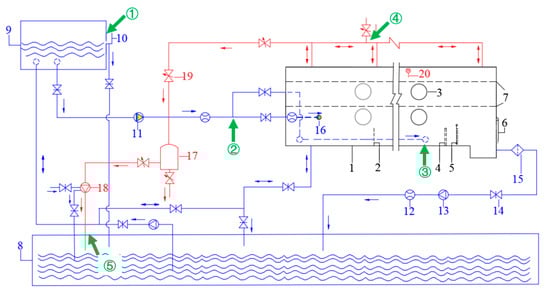 The control and maintenance of the experimental system were very important, especially under unconventional operation conditions [41]. Some details were conducive to the stable adjustment of the experimental conditions (green arrows in Figure 3): two diversion positions were arranged on an elevated water tank (①) and behind a jet pump (②), and the branch flow was back into the depressurized chamber downstream (③); suction and supplementary air pipes were connected with the same ventilation supervisor (④), and the air pipe of vacuum pump was extended to the underground reservoir to reduce air pollution (⑤).