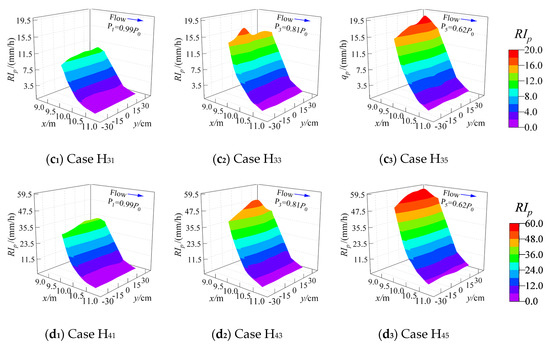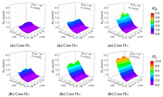 It can be seen from Figure 4 that the point rain intensity in the horizontal plane increases under constant inflow discharge conditions with the decreasing of ambient pressure, which causes an increase in the atomized zone and attenuation gradient in the flow direction along the x-axis; the rain intensity of majority measurement points in the horizontal plane increases with increasing inflow discharge under conditions with certain low ambient pressure, which is consistent with the trend of the ambient pressure effect. Comparing the enhanced effects on atomized rain induced by the lower ambient pressure and higher inflow discharge, although the increment of atomized rain intensity range due to the decrease in ambient pressure by about 0.40 P0 is smaller than that due to the increase in inflow discharge by 5 m3/h, the effect of low pressure is also very obvious, directly leading to the extension of the local protection area to the downstream.