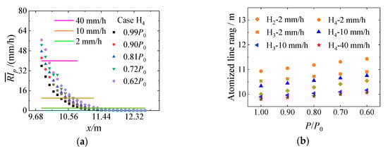 To further analyze the influence of low ambient pressure on rain intensity line range along the flow direction of the horizontal plane, the average rain intensity of the transverse line was calculated according to Equations (2) and (3). According to the partition standard of atomized rain, the atomized rain zone can be divided into four types by using rain intensity lines at 2, 10 and 40 mm/h; namely, a light fog and vapor area, a mist and rainfall area, a heavy fog and rainstorm area and a waterjet spallation and splash area. Therefore, the distance of rain intensity lines (40, 10, 2 mm/h) of the horizontal plane from the constricted nozzle outlet affected by low ambient pressure can be calculated by fitting calculation, as shown in Figure 5a,b.