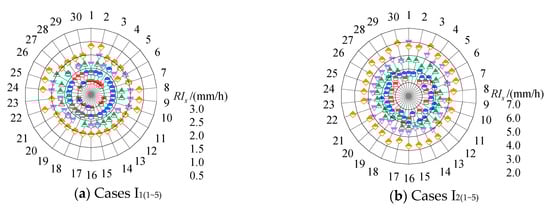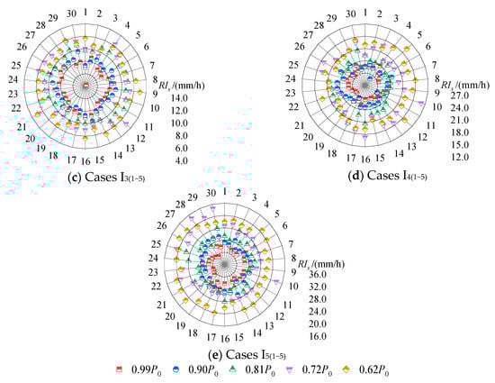 In the atomized protection of actual projects, the local protection also plays an equally important role as the whole protection. For instance, the tunnel portal and powerhouse all require a drainage system based on the assessment of surface confluent rain. Therefore, the instantaneous rain intensity of the inclined plane is calculated according to Equation (4). Figure 6 displays the instantaneous rain intensity of the inclined plane affected by low ambient pressure with five inflow discharge conditions, which is distributed on a radar map including 30 circumferential time nodes and six radial rain intensity contours that increase from inner circle to outer circle with equal gradient. The rain intensity intervals are within 0~3, 2~7, 4~14, 12~27, and 16~36 mm/h, which separately correspond with the cases of I1(1~5), I2(1~5), I3(1~5), I4(1~5) and I5(1~5) (Figure 6a–e).