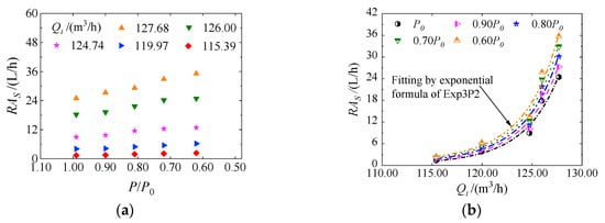 It can be found in Figure 7b and Table 3 that, under constant low ambient pressure conditions, the average rain amount increase results from the increase in inflow discharge. Under conditions with experimental inflow discharges, the growth of the average rain amount can be quantified by increasing the inflow discharge of 0.41~0.62 m3/h as the ambient pressure drops by 0.10P0, which is equal to an increase of 0.33%~0.53% relative to the standard inflow discharge. The higher the inflow discharge is, the smaller the compensation inflow discharge is, because the average rain amount increases with a composite exponential formula of as the inflow discharge increases. Therefore, the average rain amount atomized in the local area is relatively sensitive, regardless of the ambient pressure decreases and the inflow discharge increases.