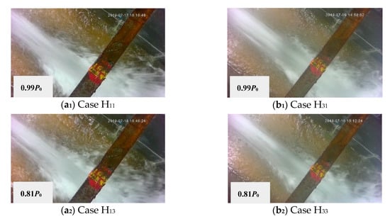 Figure 8 and Figure 9 display the waterjet diffusion in air and the downstream flow pattern in the water cushion. In Figure 8, the horizontal diffusion of the waterjet is obvious due to a high exit velocity at a magnitude of 10 m/s. Compared with the horizontal images in Figure 8 and Figure 9, the low ambient pressure with the same inflow discharge can narrow the waterjet transverse diffusion width and lessen the side-spallation under conditions with different ambient pressures and the same inflow discharge, but this parameter has less effect on the water-collision location and the downstream flow pattern in the water cushion. As stated in the studies of [31,42,43], waterjet properties can vary with aeration concentration. Zhang et al. [31] found that the upper boundaries of aerated waterjets become shorter as the aeration concentration of circular waterjets decreases and that the spallation water-droplet velocities tend to be higher. Deng et al. [42] stated that scour can become stronger when induced by rectangular submerged waterjets under experimental conditions with a lower aeration concentration and the same inflow velocity. Dong et al. [43] discovered that, regarding the dynamic pressure on the bottom of a water cushion generated by a two-dimensional submerged waterjet, the lower the aeration concentration of the waterjet is, the higher the averaged pressure is, and the lower the fluctuation pressure is. Therefore, it is speculated that the aeration concentration of the waterjet outer boundary can decrease in a low ambient pressure environment, which can increase the number of atomized line sources due to the increase in the water-entry velocity of impacting waterjet.