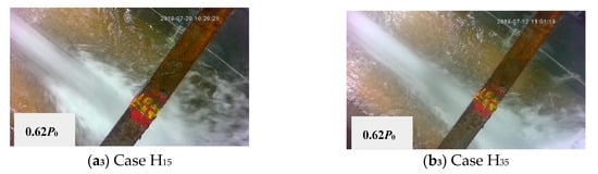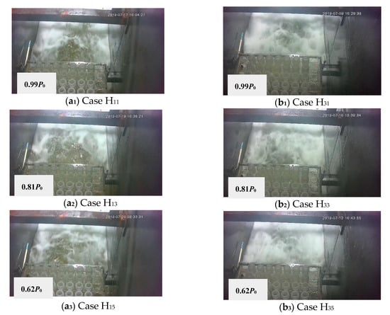 Downstream flow patterns in water cushion affected by low ambient pressure. (a) = 115.00 m3/h and = 10.65 m/s; (b) = 125.00 m3/h and = 11.57 m/s.