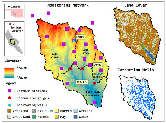 - Moriasi, D.N.; Starks, P.J.; Guzman, J.A.; Garbrecht, J.D.; Steiner, J.L.; Stoner, J.C.; Allen, P.B.; Naney, J.W. Upper Washita River Experimental Watersheds: Reservoir, Groundwater, and Stream Flow Data. J. Environ. Qual. 2014, 43, 1262–1272. [Google Scholar] [CrossRef] [PubMed]