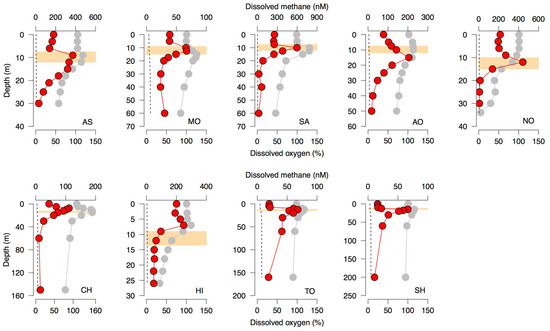 Vertical profiles of dissolved CH4 concentrations in the nine study lakes of Japan during the July to September in 2016–2017 period. AS: Lake Ashinoko, MO: Lake Motosu, SA: Lake Saiko, AO: Lake Aoki, NO: Lake Nojiri, CH: Lake Chuzenji, HI: Lake Hibara, TO: Lake Toya, SH: Lake Shikotsu. Red and gray circles refer to the dissolved methane (nM) and oxygen (%) concentrations, respectively. Dotted lines denote the atmospheric equilibrium concentration of dissolved CH4 in lake water (3.7–7.2 nM). Shaded areas denote the range of the thermocline.