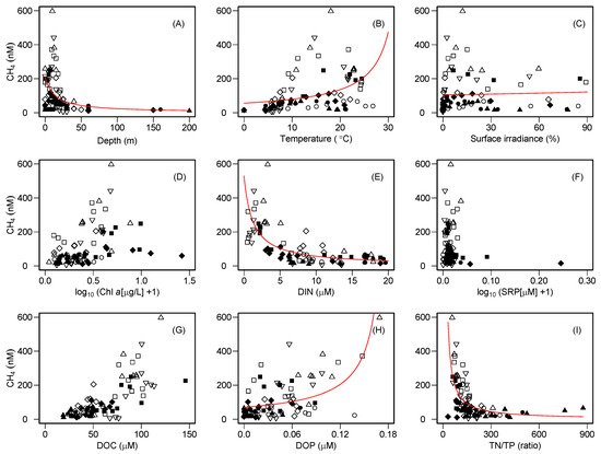 Relationships between environmental variables and dissolved CH4 concentrations in the study lakes. Univariate regression lines are shown for the explanatory variables that were retained in the best generalized linear models (GLMs) with a gamma distribution of the response variable. □: Lake Ashinoko, ○: Lake Motosu, △: Lake Saiko, ◇: Lake Aoki, ▽: Lake Nojiri, ◆: Lake Chuzenji, ■: Lake Hibara, ●: Lake Toya, ▲: Lake Shikotsu.