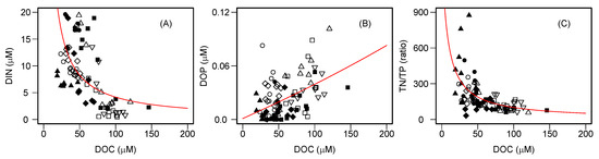 The relationships between dissolved CH4 and limnological variables suggest that DOC controls the availability of DIN, DOP, and the TN/TP ratio, thereby influencing the water-column CH4 concentration in the study lakes (Figure 2 and Figure 3). In particular, the remarkable negative nonlinear relationships of DOC with DIN and the subsequent nonlinear effects of DIN on dissolved CH4 concentrations were found. The nonlinear relationship between DOC and nitrate (NO3) has recently been reported from a wide variety of aquatic environments along a hydrologic continuum from soils to streams and lakes to coastal and pelagic ocean ecosystems [47,48,49,50]. It has been hypothesized that NO3 accumulation may occur in aquatic environments with low DOC concentrations due to an organic C limitation for assimilation and/or denitrification by heterotrophic microbes [50]. In contrast, NO3 depletion may occur in aquatic environments with high DOC concentrations due to the sufficient supply of organic C for heterotrophs. These patterns imply that stoichiometric controls of DOC–NO3 relationships over microbial activity may regulate the fate of N in aquatic ecosystems. In fact, NO3 is the dominant species of DIN in the study lakes (median = 85%, range = 0–98%). Moreover, even when we separately analyzed individual lakes, a significant negative correlation of DOC and DIN was found for each of them (r = −0.69–−0.90, p < 0.05), except Lake Shikotsu (r = −0.44, p > 0.05). Furthermore, a strong nonlinear effect of DOC on the TN/TP ratio was also evident (Figure 2), suggesting that the availability of organic carbon controls N accumulation in the water column, thereby influencing the elemental stoichiometric balance of nitrogen and phosphorus in lakes.