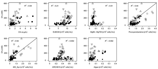 Relationships between the dissolved CH4 concentration and the cell density of microbial communities in study lakes. EUB338, bacteria; Mg84 + Mg705, type-I methane-oxidizing bacteria; 405_Syn, Synechococcus; ARCH915, Archaea (see Table S4). GLM with a Gaussian error distribution and an identity link function was used for the variables, while regression lines shown when significant (p < 0.05). See the legend for Figure 2 for a description of the symbols.