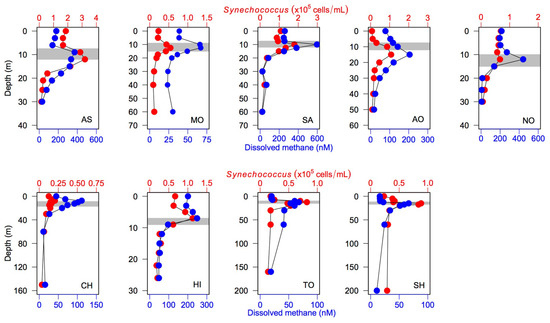 Vertical distribution of Synechococcus density (red circles) in relation to the dissolved CH4 profile (blue circles) in the study lakes. Shaded areas denote the range of the thermocline.