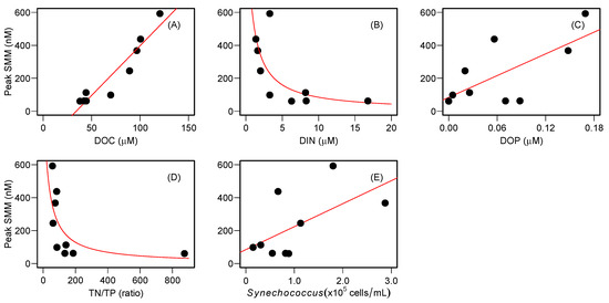 A correlation analysis between the peak SMM and environmental variables revealed that the peak SMM was positively and linearly correlated with lake DOC, DOP, and Synechococcus cell density observed at the same depth (Figure 7 and Table S6). Lakes with higher concentrations of both DOC and DOP and higher Synechococcus cell density tended to develop a larger SMM peak. Moreover, a negative nonlinear relationship of peak SMM was observed for both DIN concentration and the TN/TP ratio, implying that lakes with lower DIN and TN/TP values experienced a rapid increase in peak SMM.