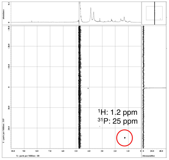 Particulate suspended matter collected from the metalimnion was characterized by a two-dimensional 1H–31P NMR analysis. The spectral region of 20–31 ppm in 31P NMR analysis is known to represent the chemical shifts of phosphonate compounds [25,46]. Our mass spectra at 1.2 ppm (1H) and 25 ppm (31P) revealed the presence of phosphonate in the suspended particles of the metalimnion in Lake Toya (Figure 8).