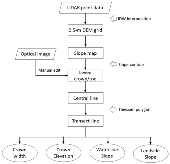 - Casas, A.; Riano, D.; Greenberg, J.; Ustin, S. Assessing levee stability with geometric parameters derived from airborne LiDAR. Remote. Sens. Environ. 2012, 117, 281–288. [Google Scholar] [CrossRef]