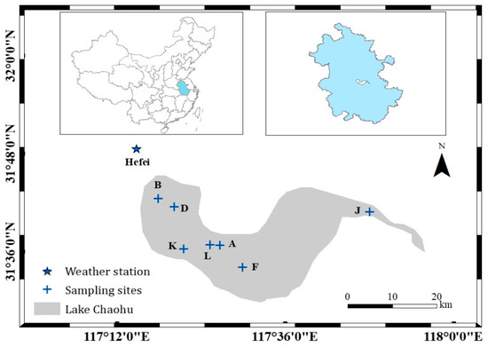 Lake Chaohu (31°43′–31°72′ N, 117°29′–117°85′ E) is a polymictic lake in Anhui Province in the lower reach of the Yangtze River (Figure 1). A large portion of the inflow is from Nanfei River, Hangbu River and Yuxi River and one outflow connecting with Yangtze River. It is the fifth largest freshwater lake in China. The mean depth of the lake is 3 m (maximum depth is 7 m), and the surface area is about 780 km2. The nearest weather station is named Hefei (31°53′ N, 117°15′ E). The lake basin experiences a northern subtropical monsoon climate with an average annual rainfall of 1100 mm. The annual average air temperature is 15–16 °C.
