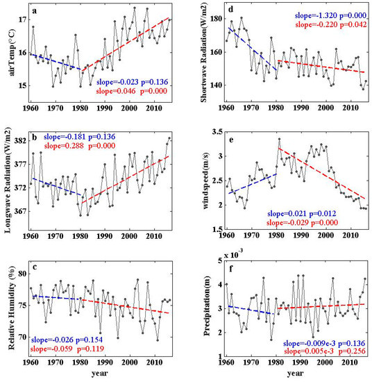 The annual value of atmospheric variables, air temperature (a), longwave radiation (b), relative humidity(c), shortwave radiation (d), wind speed (e), and precipitation (f) from 1960 to 2016. The linear trend for each variable is given during the period of 1960–1980 (blue dashed line) and the period of 1981–2016 (red dashed line).