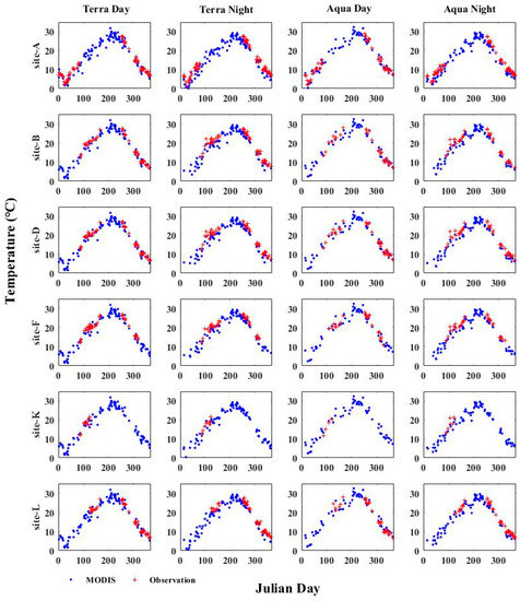 Scatterplots of annual variation of MODIS LSWT products and observed LSWT at six sites across Lake Chaohu in 2016. The first and second vertical panels represented at ~10:30 am and at ~10:30 pm. The third and fourth vertical panels represented at ~1:30 pm and ~1:30 am.