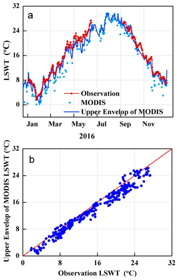 Comparison of daily LSWT between MODIS and in situ measurement over the whole lake area in 2016. Panel (a): the daily time series of LSWT from MODIS temperature product (symbols), and upper envelop smoothing correction (blue line), and in situ observation (red dot-line); panel (b): comparison of observations with upper envelop of MODIS-derived temperature.