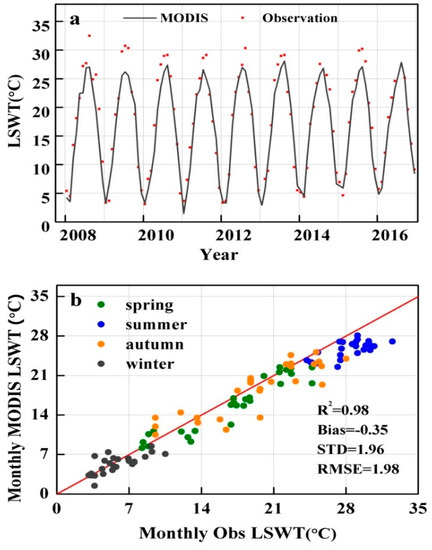 The monthly LSWT observations from 2008 to 2016 were also used to validate the performance of MODIS and MODIS–UE (Upper Envelop line) LSWT, especially to bridge the data gap during summer (from June to August) due to malfunctioning of the high-frequency loggers. Monthly observations were obtained from Kong, et al. [51], sampled monthly at a depth of 0.2–0.5 m near the lake center usually at 10:00. As shown from Figure 6, the seasonal cycle of LSWT fitted well between MODIS derive LSWT and observation, with the correlation coefficient of 0.98 and the bias of −0.35 °C. The bias was −2.05 °C in summer, higher than other spring (−1.09 °C), autumn (−0.77 °C) and winter (−0.55 °C).