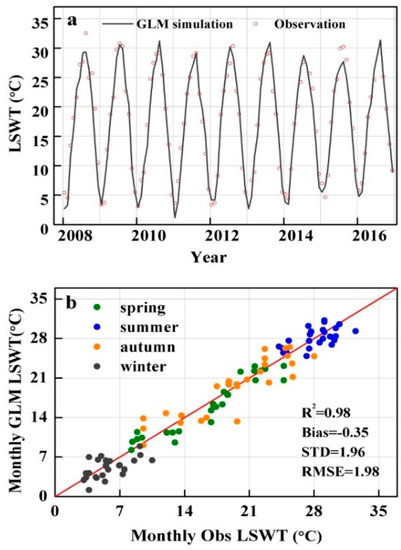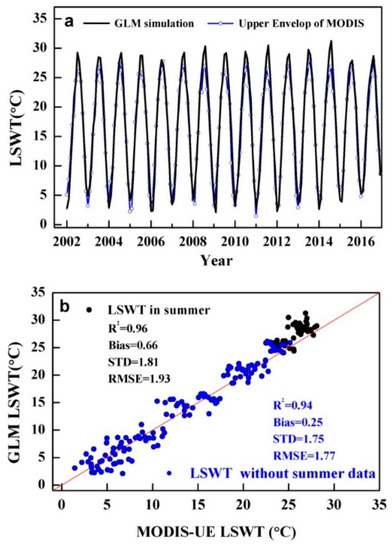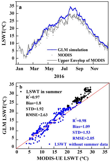 LSWT simulations compared well with MODIS–UE LSWT in 2016 (Figure 7). Bias and STD were 1.8 °C and 1.92 °C, and the correlation coefficient was 0.98. The variations were similar between MODIS–UE LSWT and GLM simulation. Then, LSWT simulation was also compared with MODIS–UE LSWT when excluding the data in the summertime, with the bias and STD value of 1.09 °C and 1.53 °C, respectively (as shown in Figure 7). The large bias of LSWT simulation was possibly contributed to the data in the summertime, as a cool bias was found clearly in the summertime. As the observation was missing during the summer of 2016, it was difficult to validate whether MODIS–UE LSWTs or simulations were corrected during the summer, especially the cool bias might have been larger than in other seasons due to the peak value of solar radiation and low wind speeds [54,88]. Hence, the monthly observations from 2008 to 2016 and the MODIS LSWT from 2002 to 2016 were also employed to validate the GLM simulations performance.