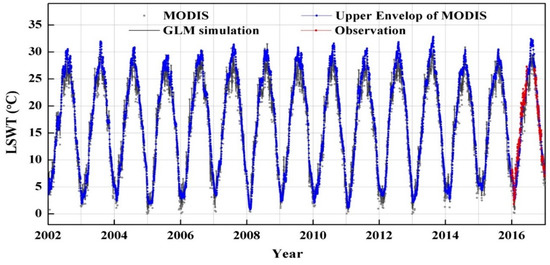 Comparison of daily LSWT between MODIS, MODIS UE and GLM simulation from 2002 to 2016 in Lake Chaohu. The grey symbols are the MODIS-derived LSWT; the blue line is the MODIS UE (Upper Envelop line)-derived LSWT, and the black line is the GLM simulation. In situ records shown as the red line are also added into the comparison.