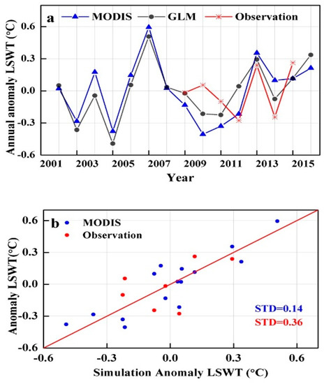 The annual anomaly values of MODIS–UE LSWT data and GLM simulations from 2002 to 2016 showed a good agreement (Figure 11), with a correlation coefficient of 0.88, a bias of 0.75 °C, and a standard deviation of 0.13 °C. The annual anomaly observations from 2008 to 2015 were also compared with MODIS–UE LSWT and simulations. The STD value was 0.13 °C compared to MODIS data and 0.34 °C compared to observation. In general, these comparisons showed that the GLM model could provide LSWT reliably and accurately. Thus, GLM could be used for long-term simulations to detect changes in LSWT.