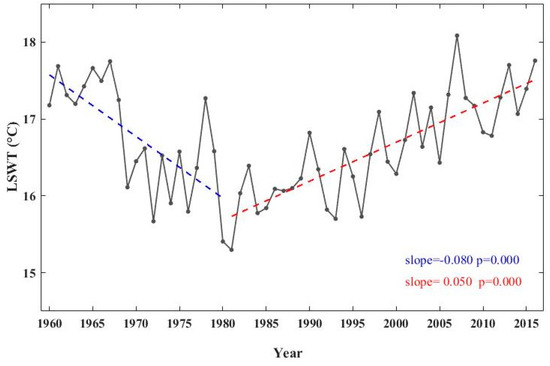 Annual LSWT during the period of 1960–2016 from the GLM simulation. Linear trends are given over the period of 1960–1980 (blue dashed line) and of 1981–2016 (red dashed line).