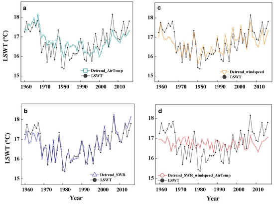 The plot of variation of simulation LSWT compared with detrending analysis from 1960 to 2016: the simulated LSWT forced by non-detrend meteorological input (black dot line) and forced by detrending air temperature (a), shortwave radiation (b), wind speed (c), and forced by detrending jointly variables (air temperature, wind speed, shortwave radiation) (d).
