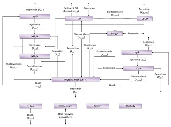 The biochemical reactions considered for each species were modeled with the source terms . Each solid arrow in Figure 1 represents a biochemical reaction and was modeled as a first order reaction [,]. The formulations used to compute the different source terms are basically the same as those used in well-known and extendedly used models such as WASP, QUAL-2K and CE-QUAL-W2, which follow []. The details of the equations implemented in IberWQ are given in Appendix A and Appendix B, while the model constants to be introduced by the user are detailed in Appendix C.