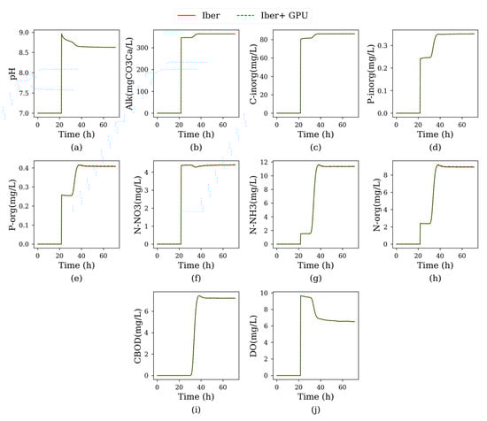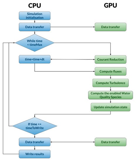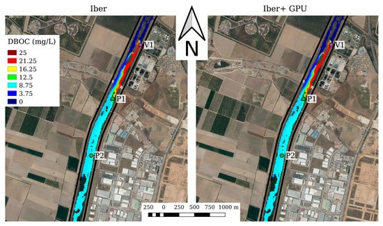 Another practical limitation of IberWQ was the computational burden required to compute real cases. Most studies imply the simulation of several water quality parameters over large spatial domains and rather long time intervals. The implementation of water quality early warning systems also requires very fast computational codes to immediately and effectively respond to hazardous events. As IberWQ solves the conservation and water quality transport equations on a fine numerical grid, it requires a high computational time (hours or days depending on the specific case). A natural way to overcome this limitation is the implementation of HPC (high performance computing) techniques. This approach had already been implemented for the hydrodynamic module of Iber [] using GPU (graphical processing unit) parallelization techniques. Due to these developments, the new implementation is able to achieve speed-ups up to nearly two orders of magnitude.