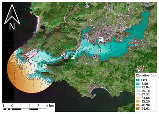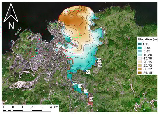 Bathymetry of the estuary of A Coruña (NW, Spain). The sewage spills are located at V1, V2, V3 and V4. The control points are placed at P1, P2 and P3.