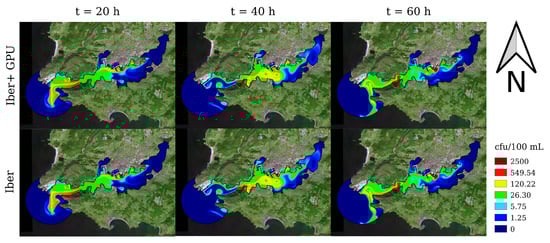 Comparison of Escherichia coli concentrations at different time steps obtained with Iber (CPU) and Iber+ (GPU).