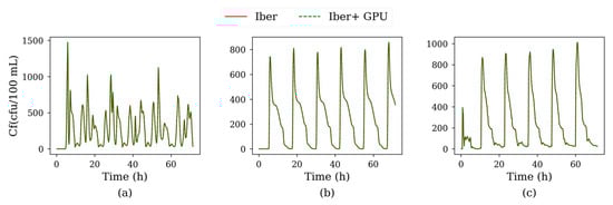 The E. coli concentration was sampled at three control points (P1, P2 and P3 in Figure 3). Figure 4 compares the spatial distribution of E. coli in the estuary at different time steps for the CPU and GPU implementations. The results obtained with Iber and Iber+ were virtually identical. The time series of concentration at the three control points are shown in Figure 5 where no significant differences could be observed. Furthermore, the time series of concentration obtained with the GPU and CPU implementations were statistically compared in terms of the normalized root mean square deviation (in %):