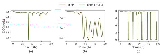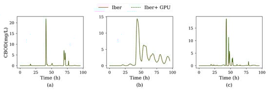 In the second test case, the levels of CBOD and DO were sampled at four control points shown in Figure 6. In particular, the time series of CBOD computed at these control points are shown in Figure 7 with identical results for both implementations. Regarding DO concentration (Figure 8), very small differences could be appreciated at control point P2, where the peak values computed with Iber+ were slightly higher than those computed with Iber. Statistically, the differences were not significant with a negligible average error (⟨⟩ = 0.32%, covering all points and variables), although higher than in previous case.