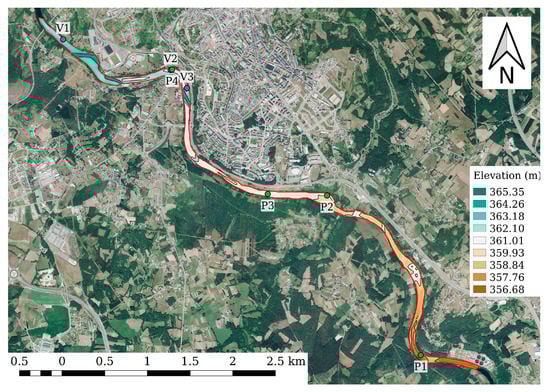 Bathymetry of the Miño River as it passes through the city of Lugo (NW, Spain). The sewage spills are located at points V1, V2 and V3. The control points are located at P1, P2, P3 and P4.